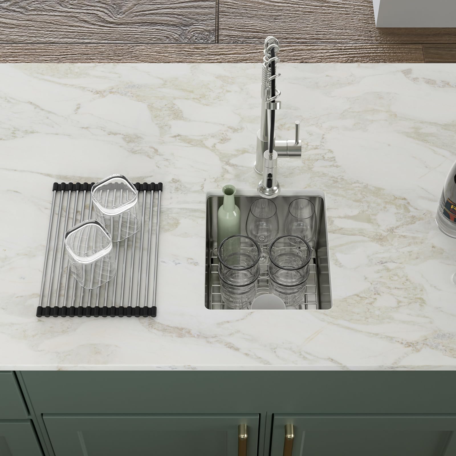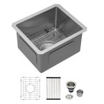 - ACCESSORIES INCLUDES: 13 inch bar sink, roll-up dish drying rack, drain assembly, bottom rinse grid, cutout template, mounting hardware and installation instruction.
