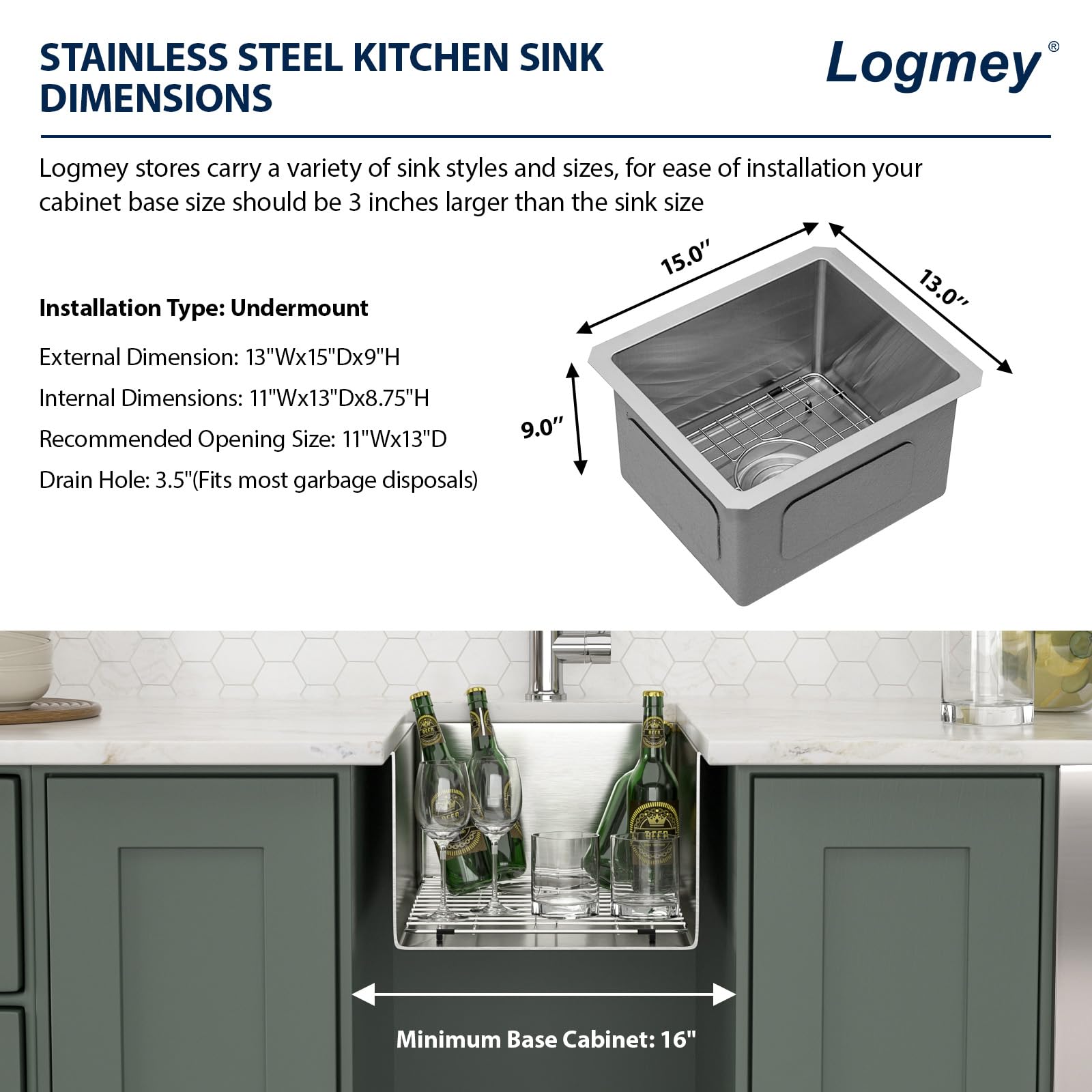 - DEMENSIONS: Exterior Dimensions:13″x15″x9″, Interior Bowl Dimensions: 11″x13″x8.75″,Recommended Opening Size: 11″Wx13″D,Minimum Cabinet Size: 16″. Undermount Bar Sink rear set 3.5″ drain hole that matches most kitchen appliances and fits the most Common Garbage Disposal System.