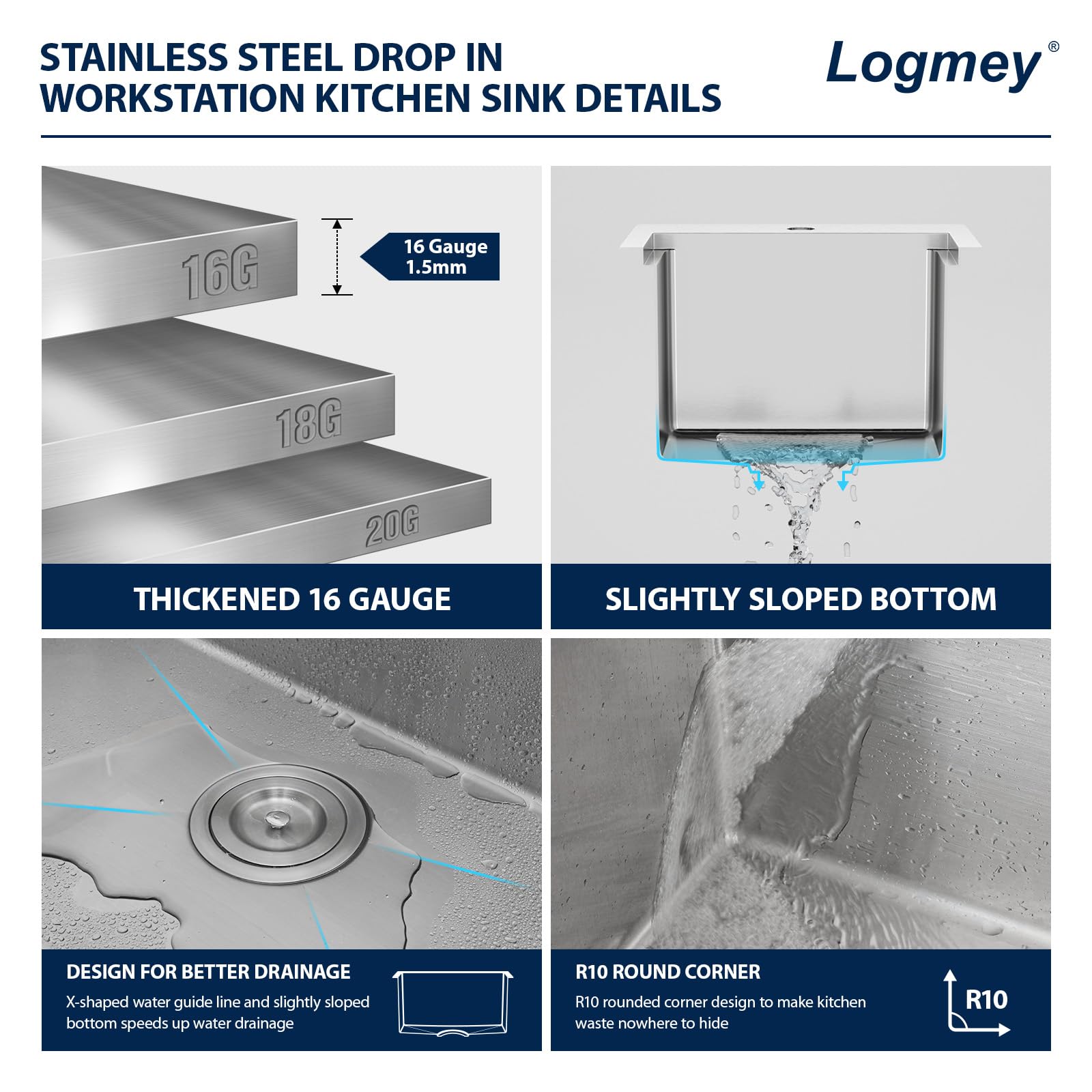 - SOLID CONSTRUCTION: Logmey drop in Bar sink is constructed of heavy duty 16 gauge SUS304 stainless steel. Drop in workstation sink with commercial-grade brushed finish resists dents and scratches, is easy to clean and has a long service life.