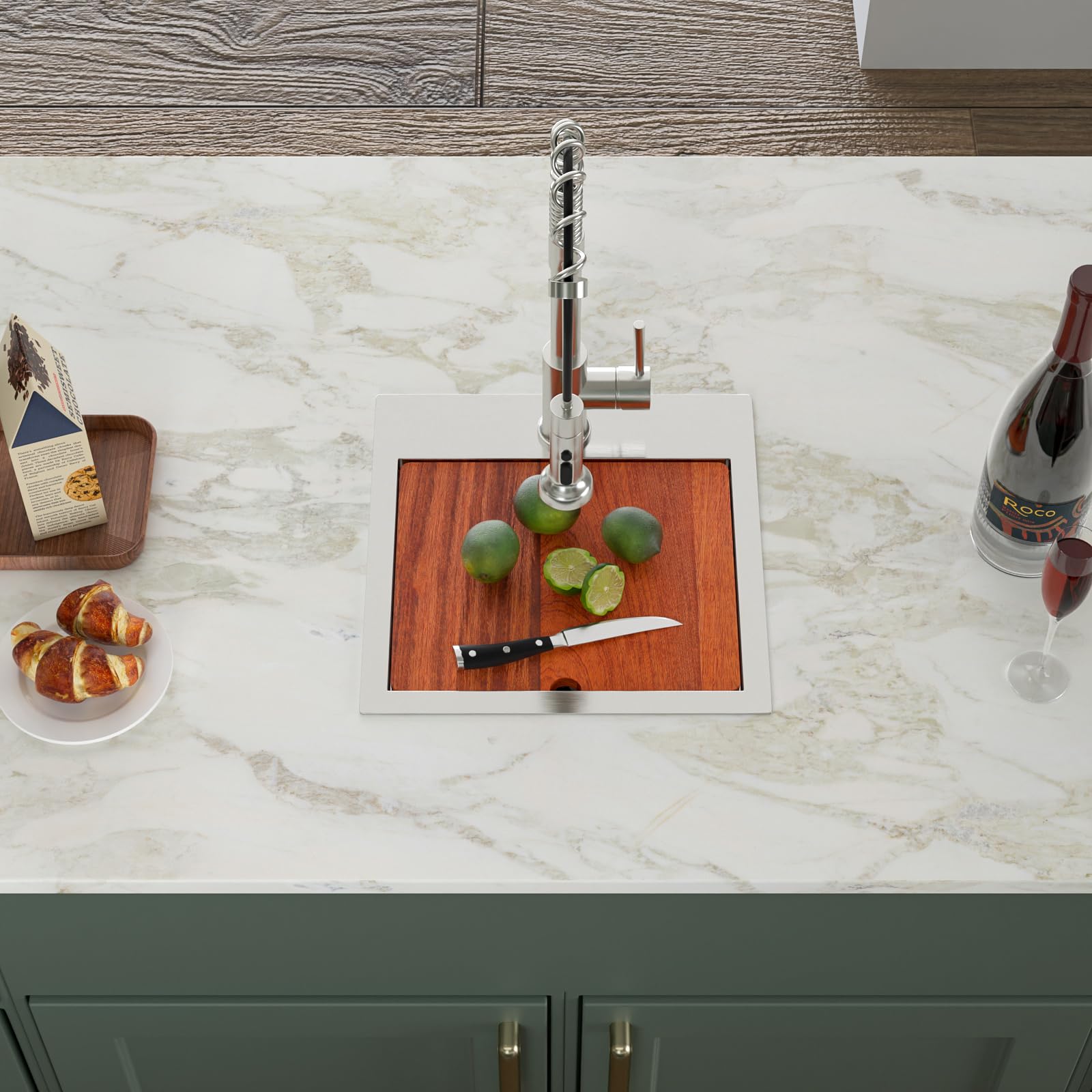 - WORKSTATION DROP IN KITCHEN SINK: This 15 inch drop in kitchen sink offers a track at the front and back on which you can freely slide the accessories you need to use. This design allows for a cleaner kitchen where all pre and post meal tasks can be done at this top mount sink, saving more space and time.