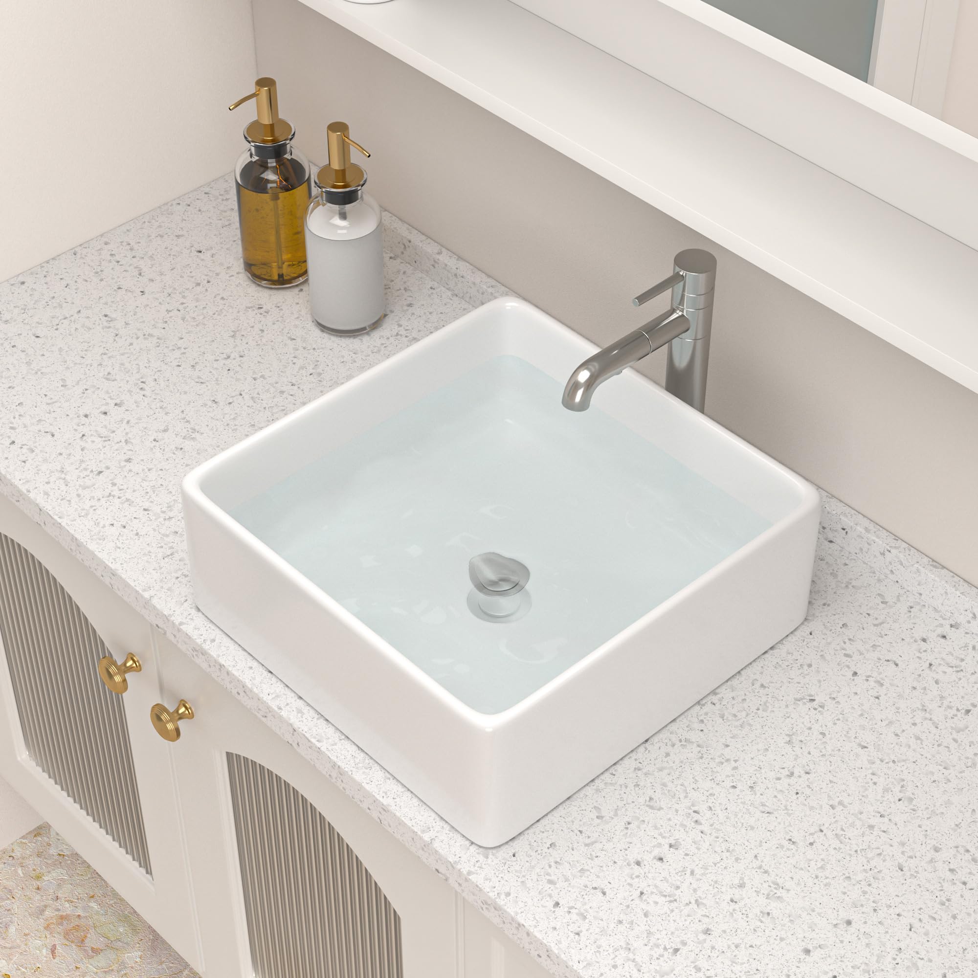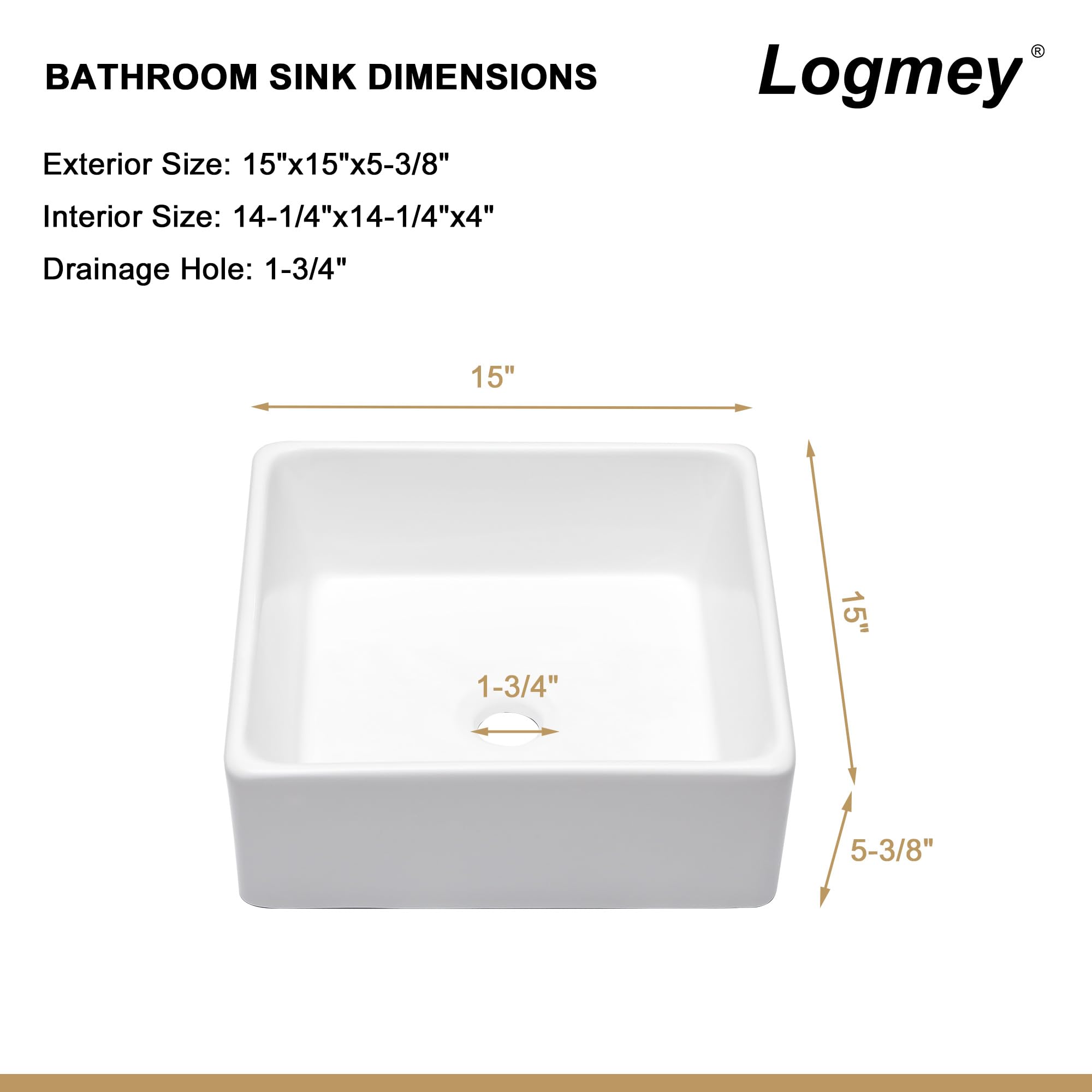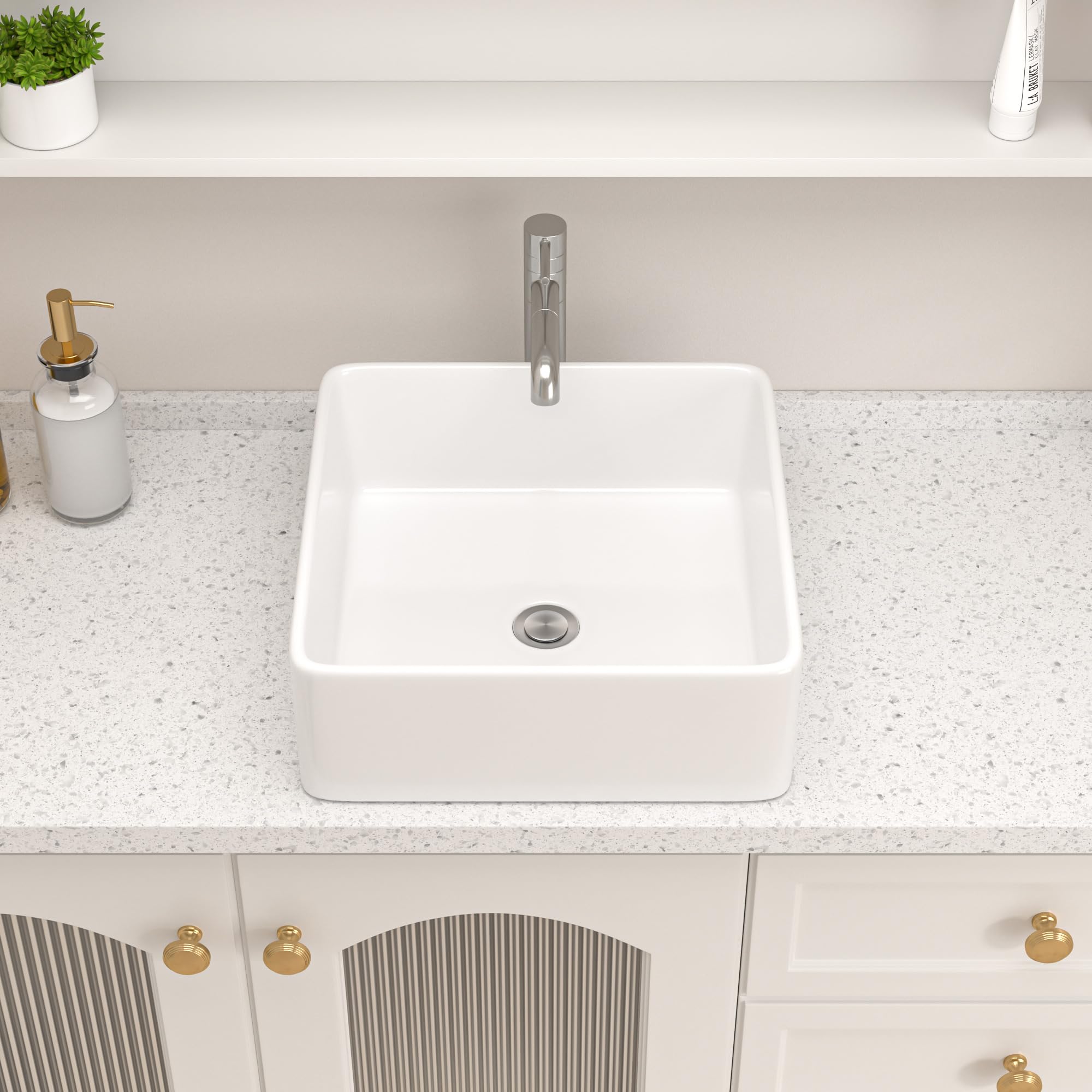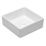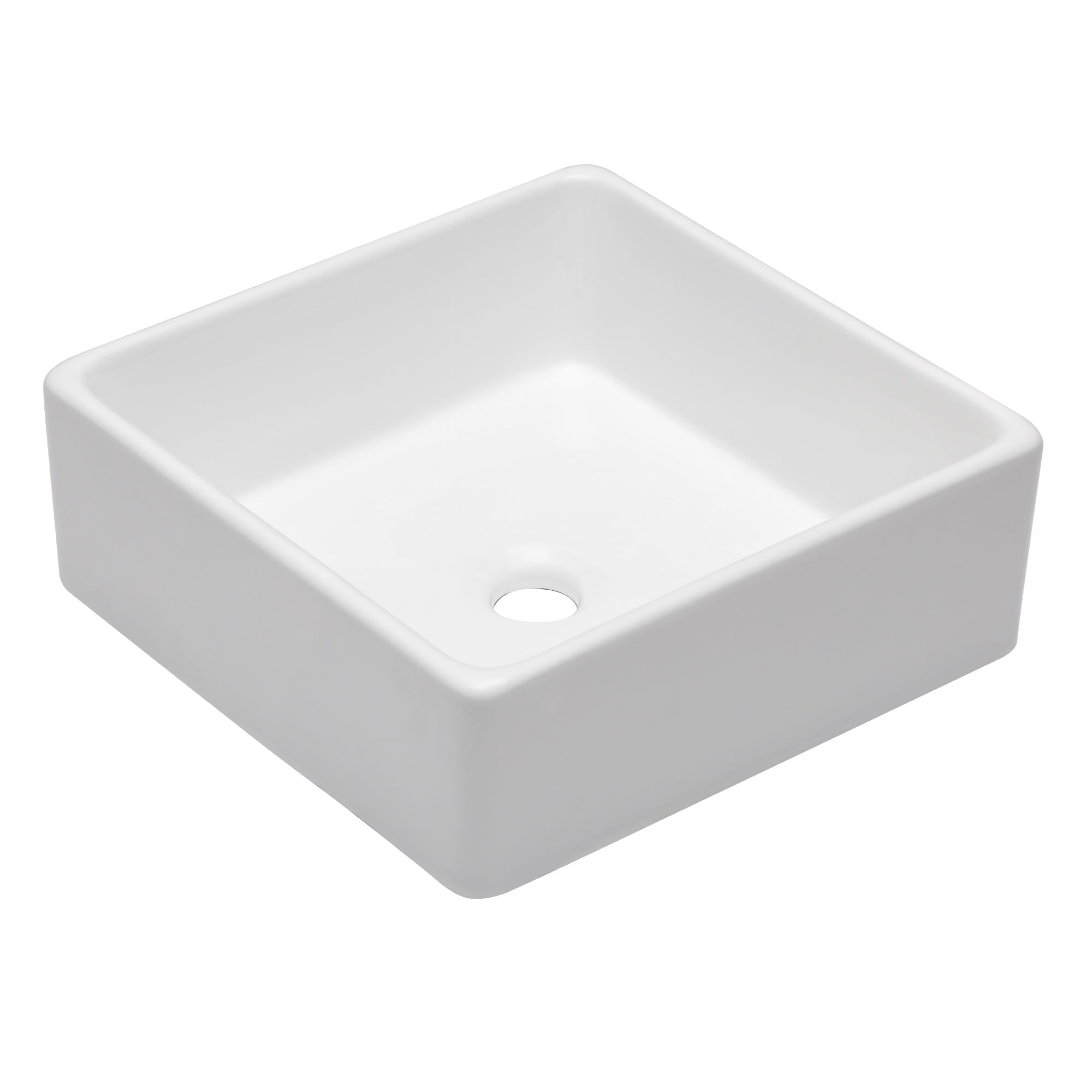 - White Vessel Sink Size:Exterior Size: 15″Wx15″Dx5-3/8″H,Interior Size: 14-1/4″Wx14-1/4″Dx4″H,Suitable DrainSize: Standard 1-3/4″drain opening. Faucet and pop up drain not included – must be purchased separately.Itis recommended that the cabinet be a minimum of 3 inches larger than the size of the product.