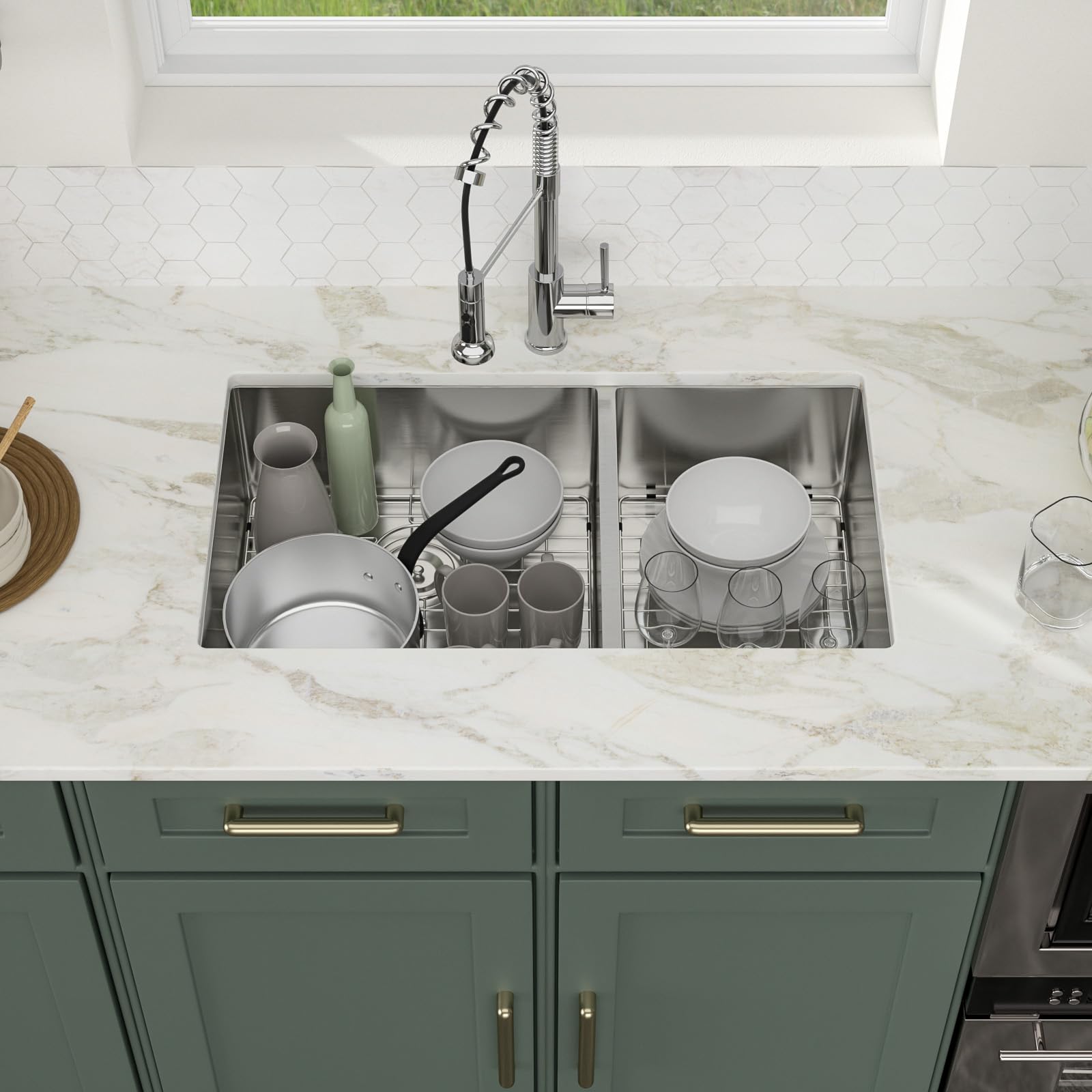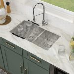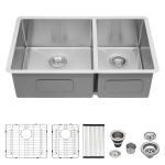 - This 33 inch double sink as well as the accessories are made of 304 stainless steel.