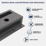 • Detailed Design Sink: This workstation Kitchen Sinks boasts a sloped drain area with X-shaped grooves for quick drainage. The 3mm anti-acoustic coating and rubber mats ensure a quieter kitchen. The anti-condensation coating prevents moisture buildup, while rounded corners make cleaning effortless. The 9″ deep bowl is perfect for large cookware
