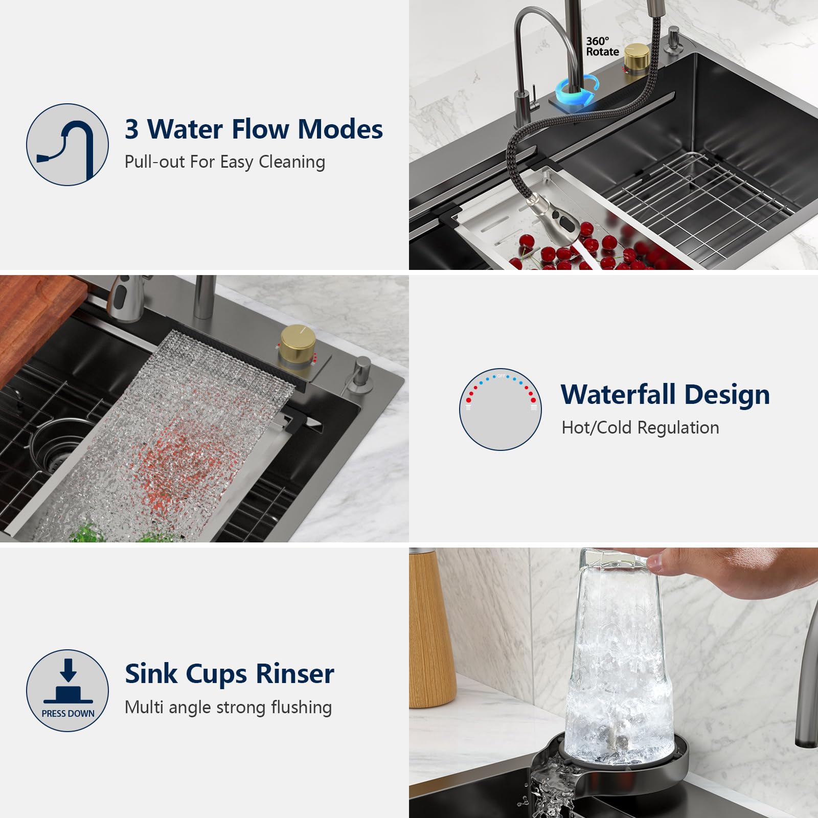 • Multifunctional Waterfall Sink: This waterfall workstation kitchen sink features dual tracks that maximize your workspace. Slide the built-in accessories to transform the sink into a versatile workstation, enhancing kitchen efficiency. The 360-degree pull-out swivel faucet offers three water flow settings (powerful, spray, stream) and allows easy switching between hot and cold water to suit your needs. Additionally, the sink includes a cup washer that uses a powerful stream to rinse residue from cups in seconds.