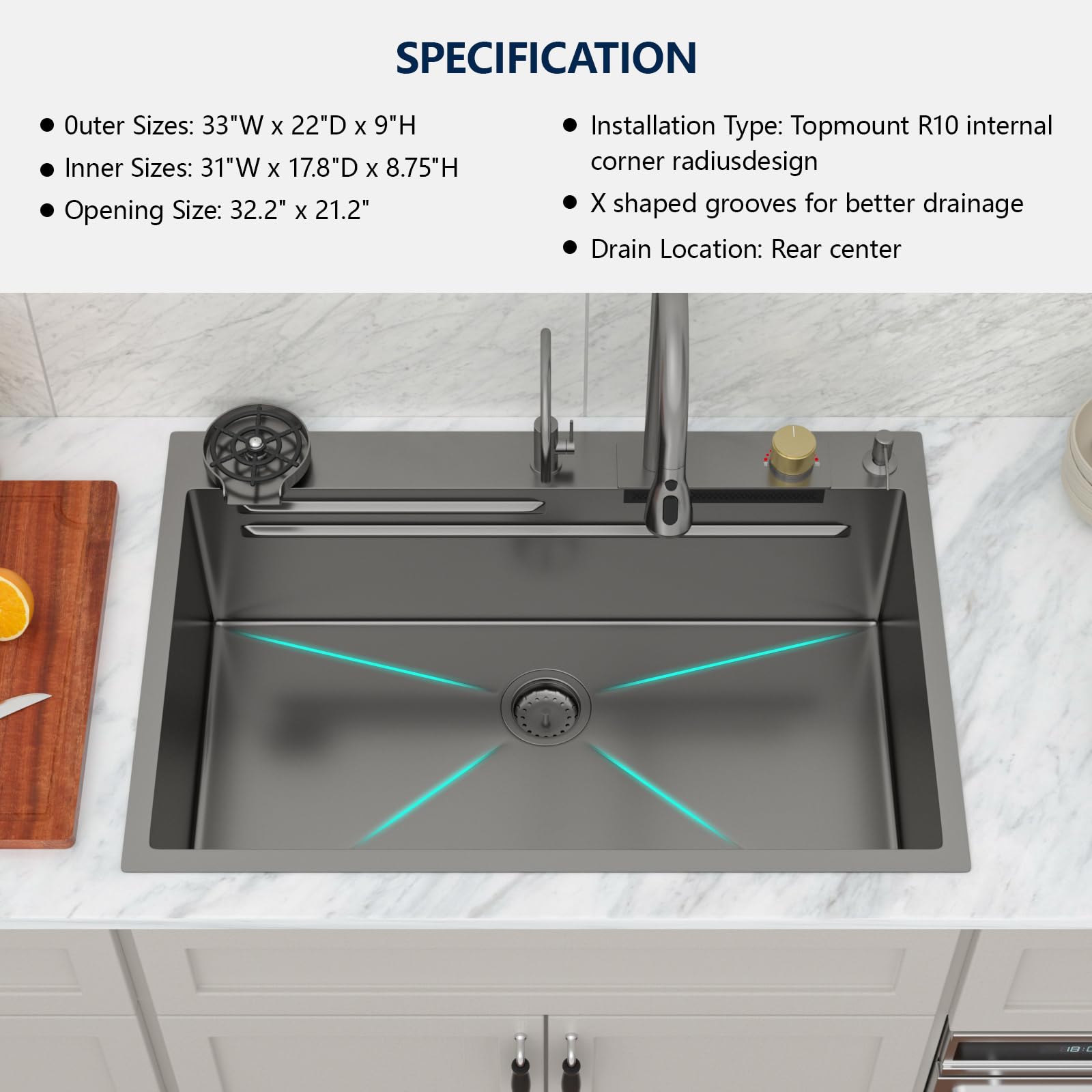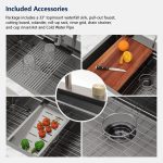 • Size And Installation: Exterior dimensions: 33″ x 22″ x 9″ | Interior dimensions: 31″ x 17.8″ x 8.75″ (minimum cabinet size is 36″) | Standard 3.5″ drain fits garbage disposals. Package includes a 33″ topmount waterfall sink, pull-out faucet, cutting board, colander, roll-up rack, rinse grid, drain strainer, and cup rinser (small faucet not included).NOTE: Basket Strainer only for standard plumbing, if you are installing a garbage disposal, an additional flange is required.