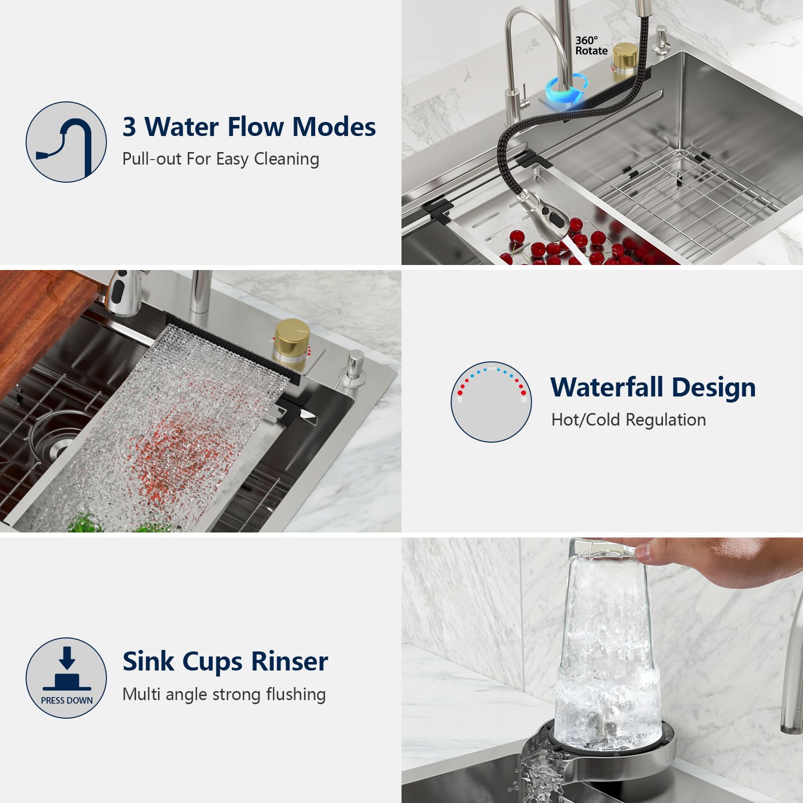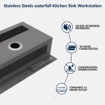 - Multifunctional Waterfall Sink & 3 Outlet Water Effect Pull Out Kitchen Faucet: This waterfall workstation kitchen sink has two tracks to provide you with more space to use. You can slide the built-in fittings to make this kitchen sink a makeshift workspace, a multi-functional sink for you to improve kitchen efficiency. 360 Degree Pull Out Swivel Nozzle Kitchen Tap offers 3 spout settings (powerful, spray, stream), with a choice of different water flow patterns to suit your needs. The kitchen sink’s addition is the cup washer, which is a glass washer with a powerful stream of water that thoroughly rinses residue from cups in seconds.