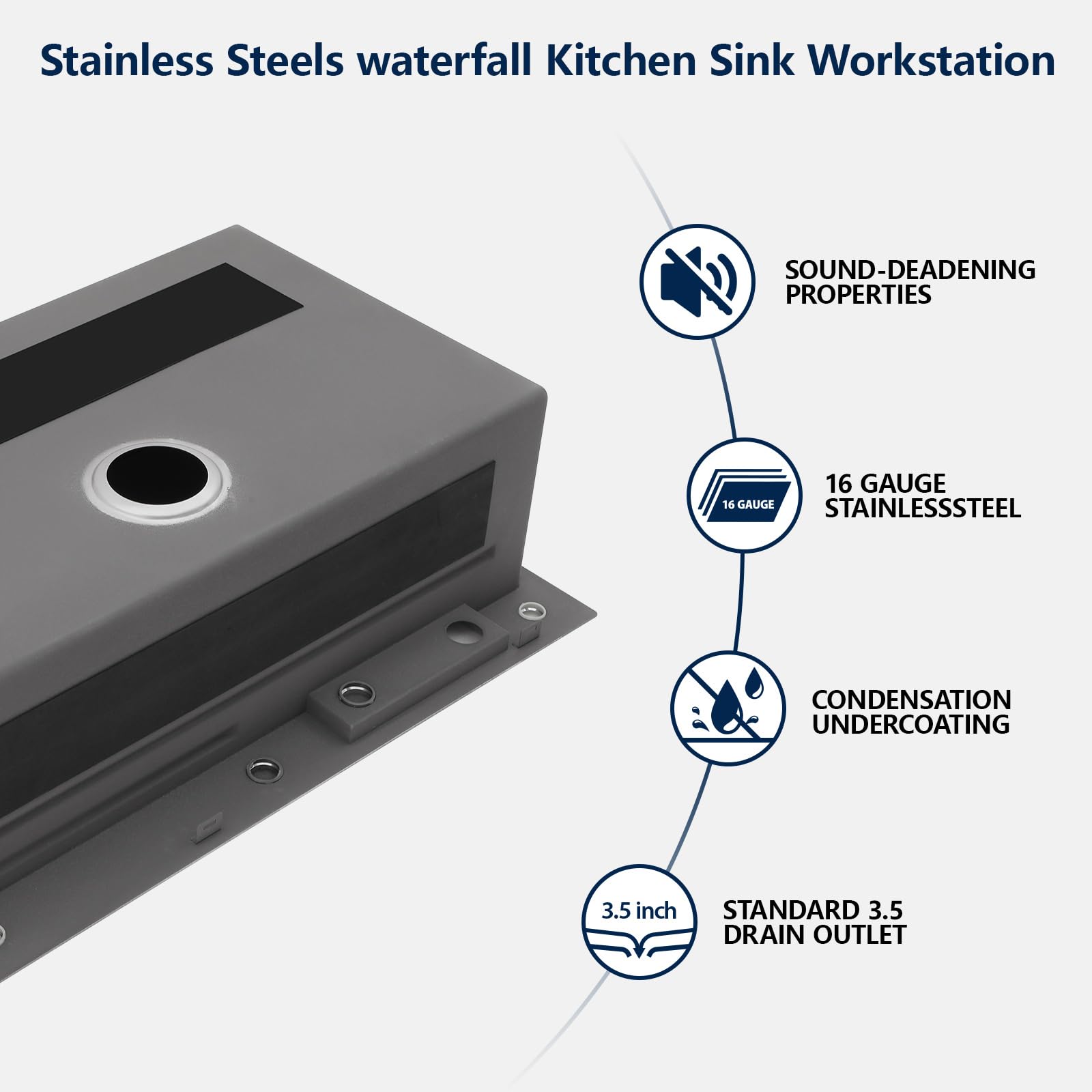 - Detailed Design Sink: This workstation Kitchen Sinks boasts a sloped drain area with X-shaped grooves for quick drainage. The 3mm anti-acoustic coating and rubber mats ensure a quieter kitchen. The anti-condensation coating prevents moisture buildup, while rounded corners make cleaning effortless. The 9″ deep bowl is perfect for large cookware