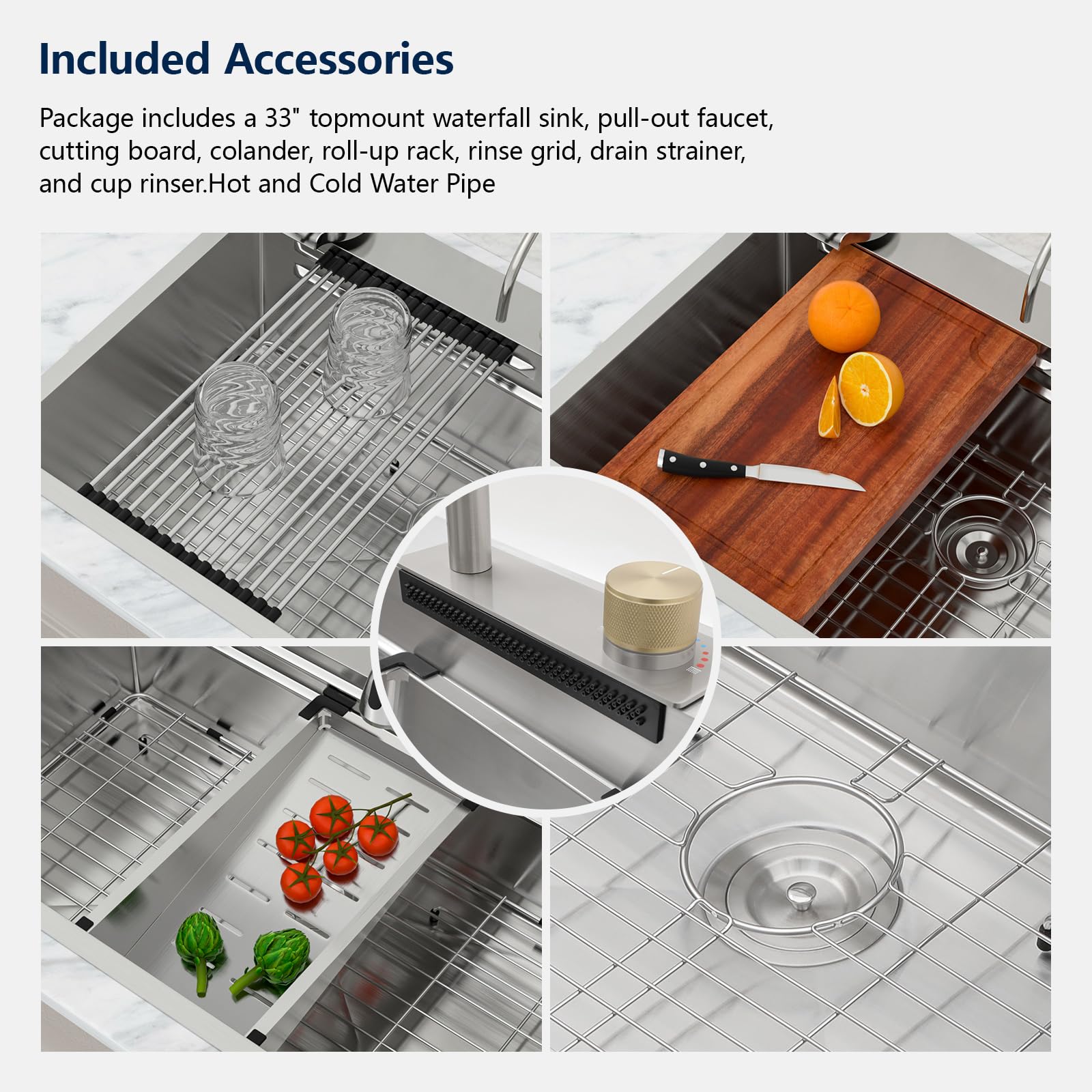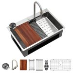 - Size And Installation: Exterior dimensions: 33″ x 22″ x 9″ | Interior dimensions: 31″ x 17.8″ x 8.75″ (minimum cabinet size is 36″) | Standard 3.5″ drain fits garbage disposals. Package includes a 33″ topmount waterfall sink, pull-out faucet, cutting board, colander, roll-up rack, rinse grid, drain strainer, and cup rinser (small faucet not included).NOTE: Basket Strainer only for standard plumbing, if you are installing a garbage disposal, an additional flange is required.